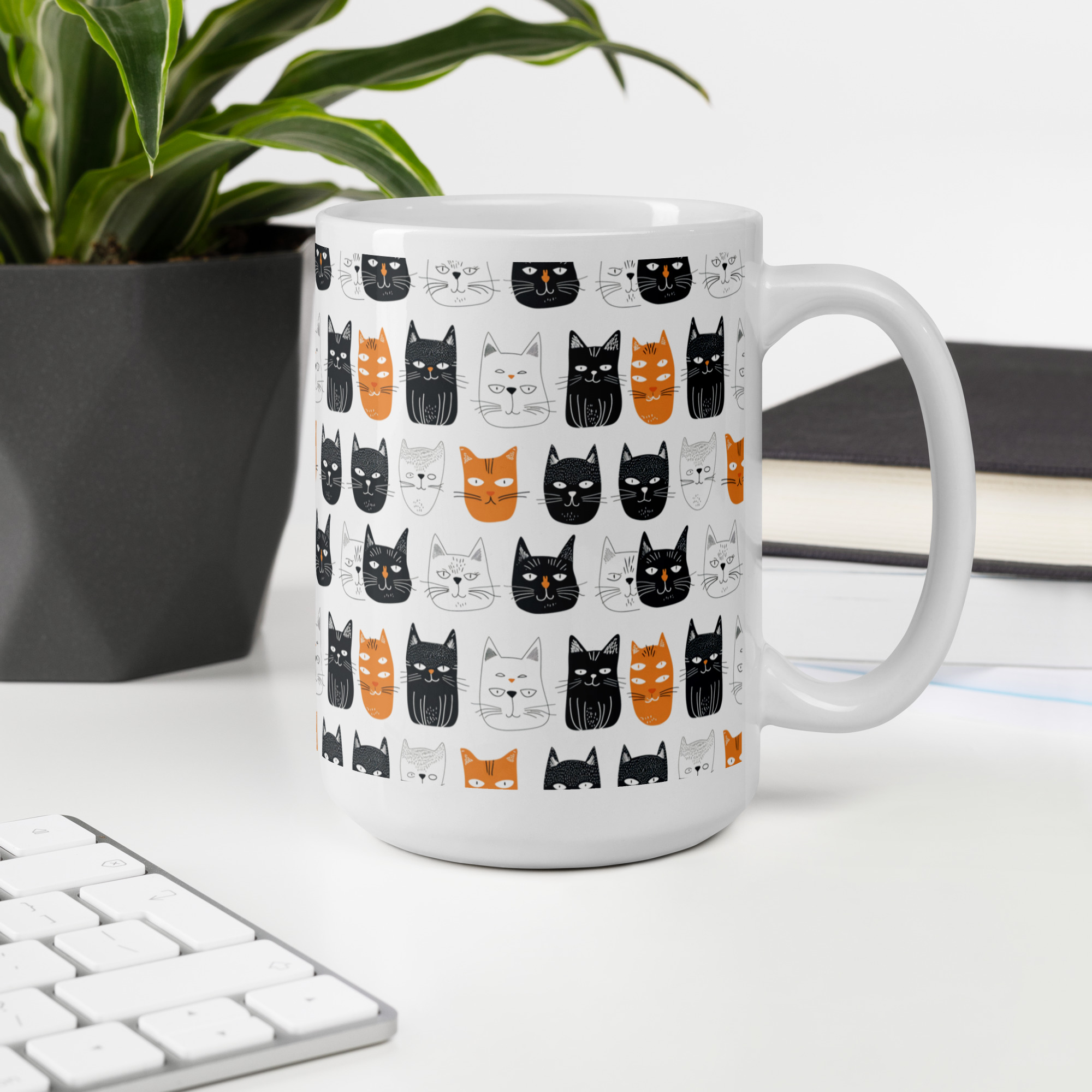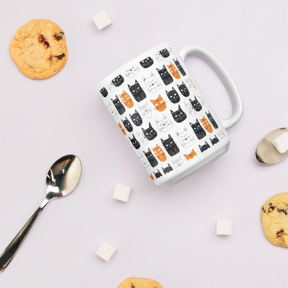 Cozy up with your morning brew in this charming mug that’s a must-have for any cat enthusiast. This delightful design is speckled with an array of cat faces, each with its own personality and expression. From the stoic black cat to the inquisitive orange tabby, this pattern celebrates the diverse and enigmatic nature of our feline friends. The playful illustrations are set against a clean, white background, ensuring each cat’s features pop—capturing the heart of cat lovers with every sip. Whether you’re starting your day or taking an afternoon break, this mug is the ideal companion for moments of relaxation, filled with warmth, comfort, and a touch of whimsical kitty charm. It’s sturdy and glossy with a vivid print that’ll withstand the microwave and dishwasher.