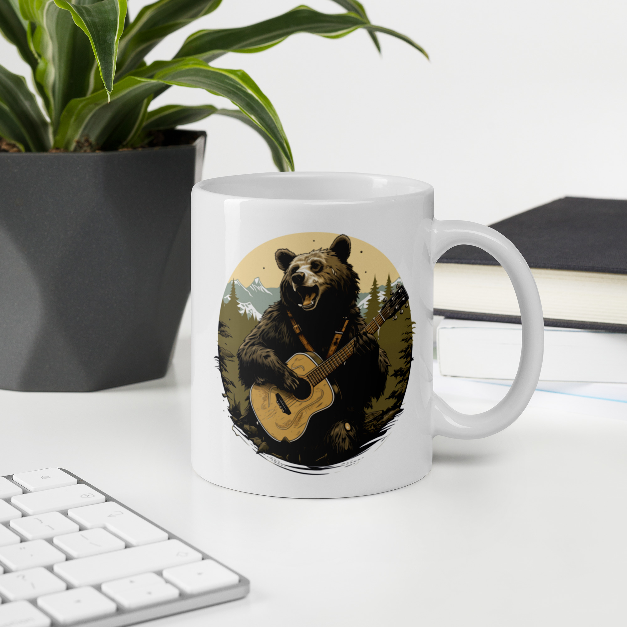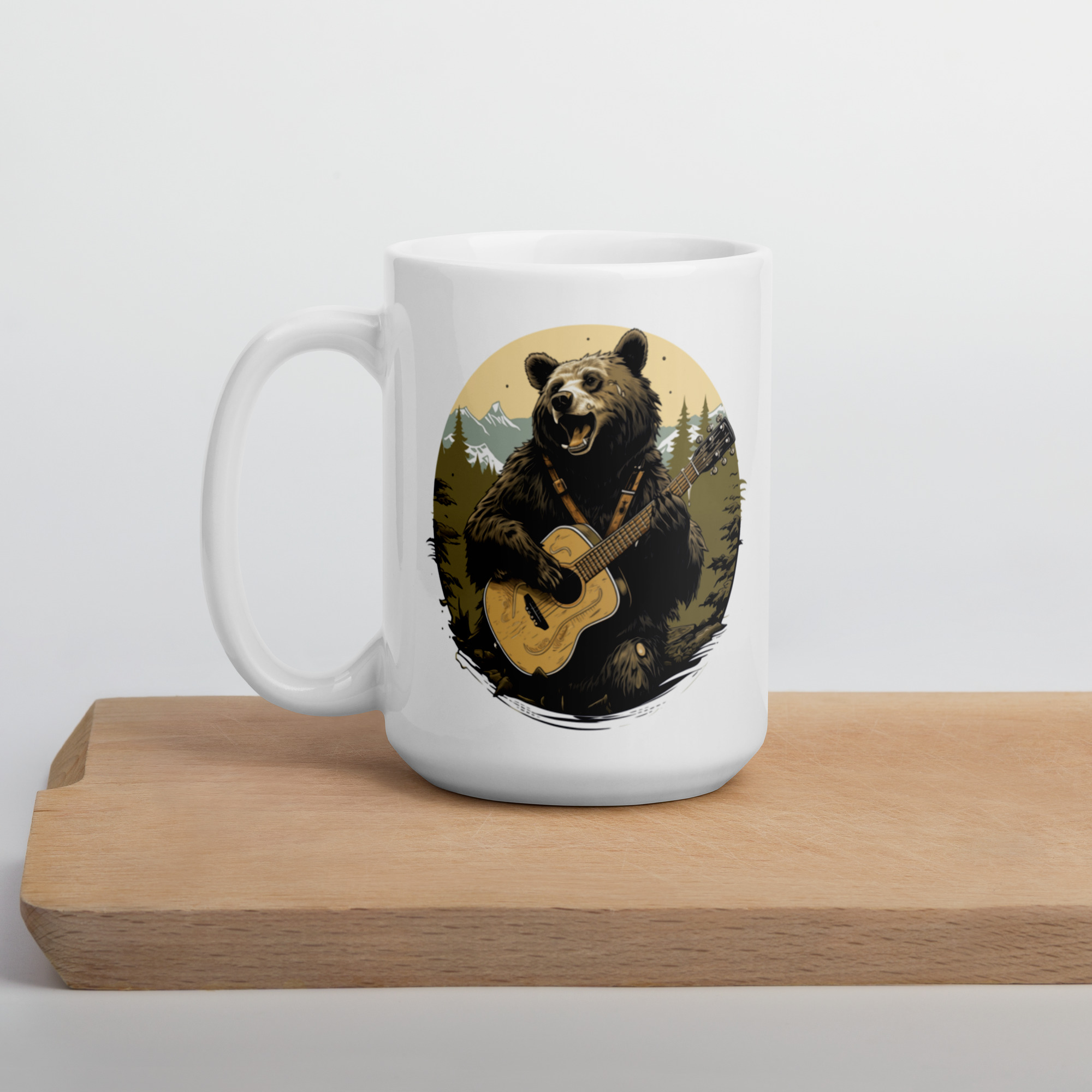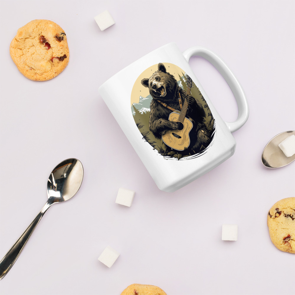 Sip your coffee to the rhythm of the wild with this captivating coffee mug design, featuring a jubilant black bear playing a golden banjo. Set against a serene backdrop of towering pines and majestic mountains, this illustration is a harmonious blend of nature and music. The bear, with a coat as dark as the rich coffee you enjoy, is portrayed mid-strum, adding a sense of movement and joy to your morning routine. This mug isn’t just a drinkware item; it’s a piece of art that brings the spirit of the forest into your daily life. It’s ideal for music lovers, outdoor enthusiasts, or anyone who appreciates a touch of whimsy with their warm beverage. Make every coffee break a moment to remember with this musically inspired bear bringing a smile to your face. It’s sturdy and glossy with a vivid print that’ll withstand the microwave and dishwasher.