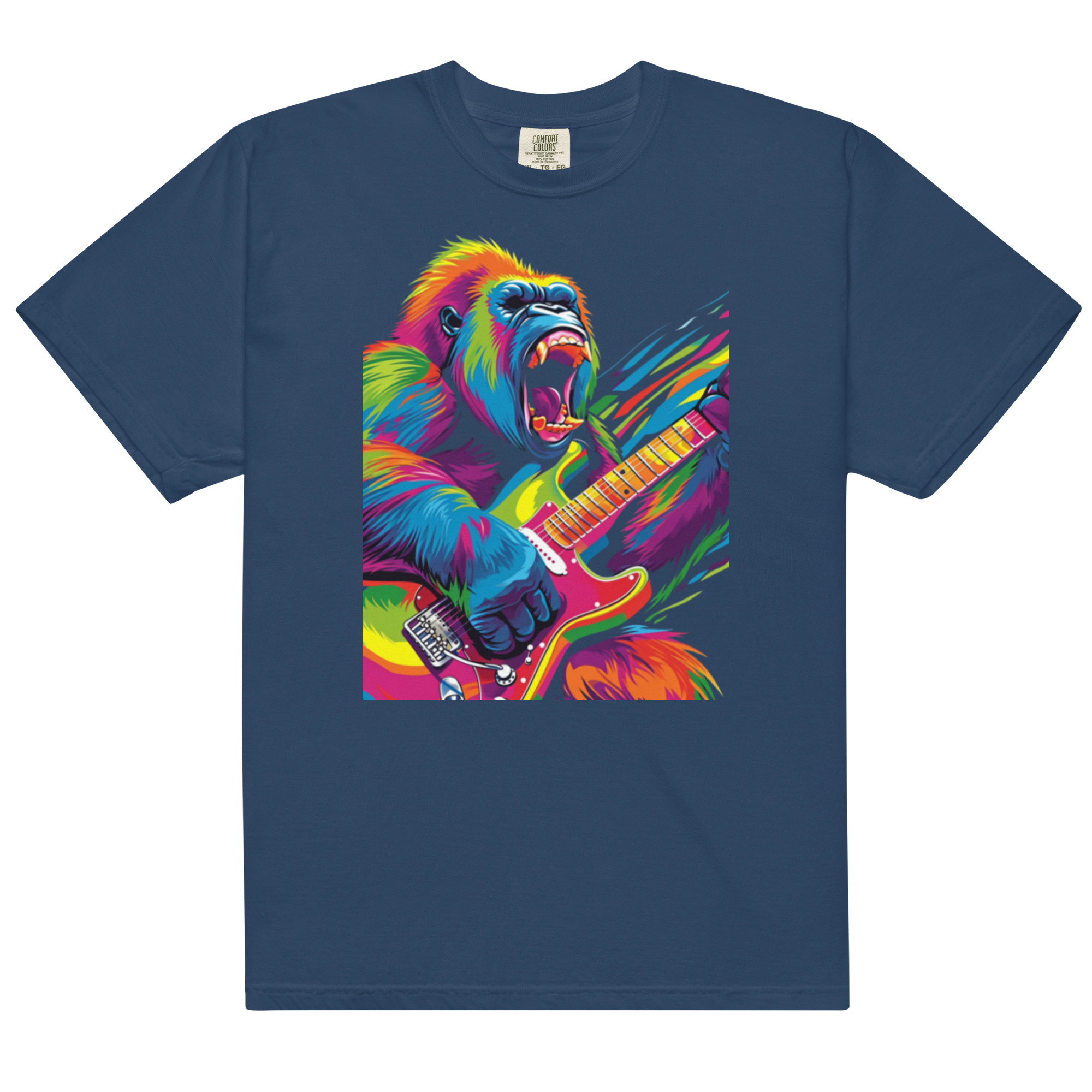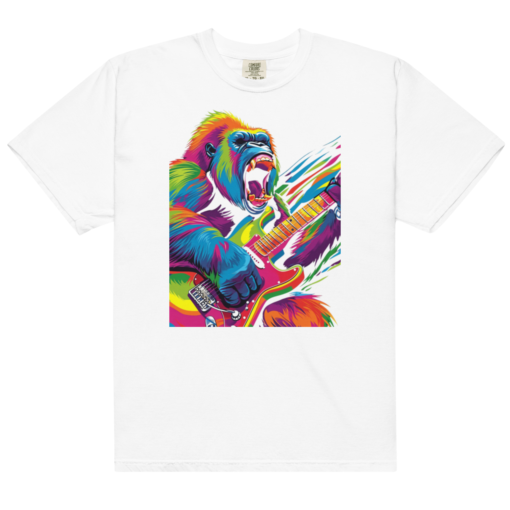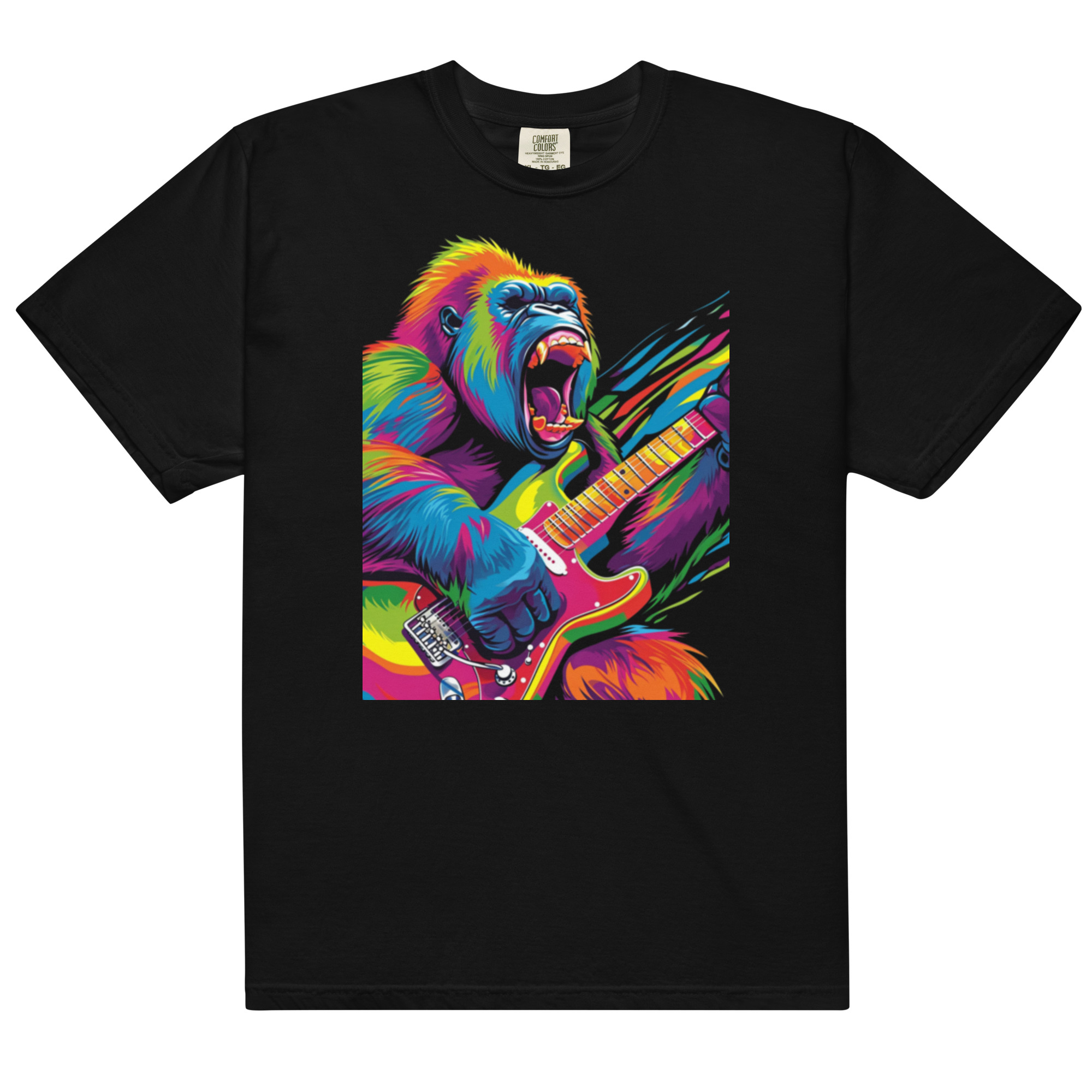 Unleash your inner rockstar with the “Rock ‘n’ Roar” t-shirt, featuring a wildly colorful gorilla in mid-solo on a vibrant electric guitar. This electrifying design bursts with a spectrum of bright colors against a deep black background, capturing the essence of rock and roll energy and animalistic intensity. Each strand of the gorilla’s fur is a stroke of vivid color, and the guitar is rendered with almost psychedelic detail. Perfect for music festival goers, guitar enthusiasts, or anyone who loves bold, graphic tees with a punch of personality. This shirt doesn’t just say you’re part of the crowd; it screams that you’re leading the band.